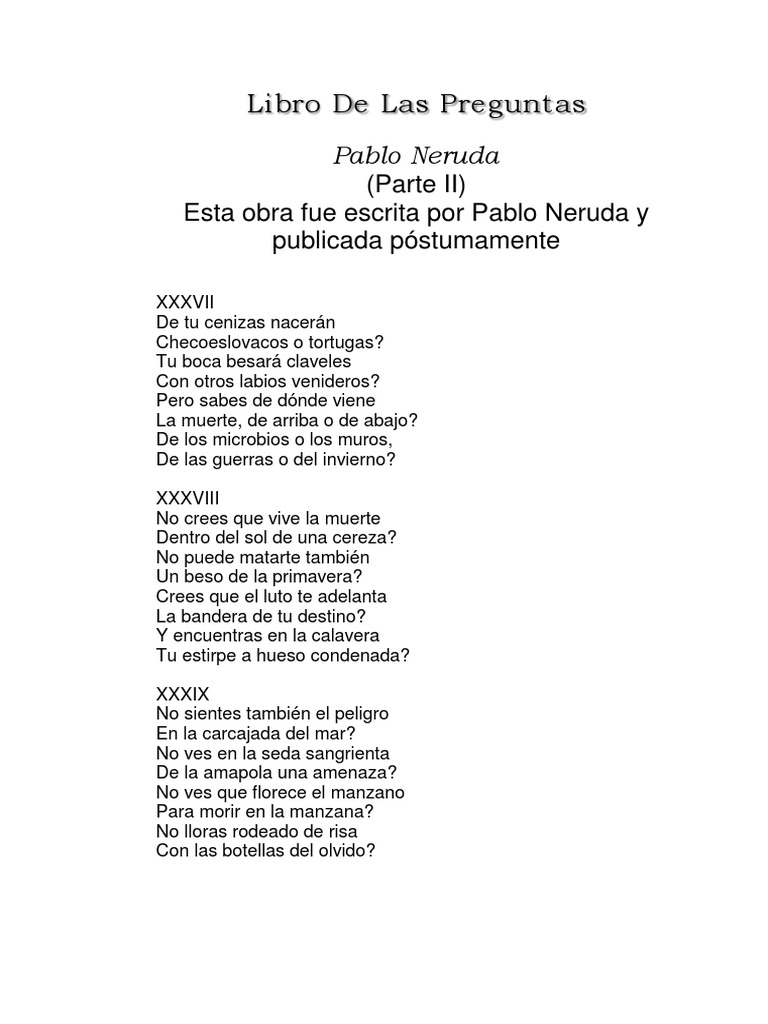 No se pasean con sus hijos? Es muy característico de neruda en el sentido de que las imágenes, las. Preguntas como estas son las que pablo neruda escribió, que nos invitan a echar volar la imaginación en busca de respuestas, como si se tratara de un juego. With it's composition, he comes full. Su padre fue obrero y su madre madre maestra de escuela, ella fallece cuando él tenía un mes de nacido. Libro de las preguntas, es una obra póstuma del poeta chileno pablo neruda, son preguntas poéticas sin respuestas, que iba escribiendo a lo largo de su vida, se recolectaron y en argentina se publicó el libro. Si he muerto y no me he dado cuenta a quién le pregunto la hora? Las más interesantes y profundas reflexiones, tapizadas de preguntas, en algunos momentos sin respuesta clara, están demostradas en estos versos que incluso eran parte de un concurso de sin más preámbulos, les dejamos con un extracto de el libro de las preguntas de pablo neruda. Buy libro de las preguntas by pablo neruda (isbn: Este libro póstumo de neruda reúne poemas en forma de pregunta, o quizá al revés, neruda cuestiona todo: Que llena el nido de limones? ¿hay en el cielo de colombia un coleccionista de nubes? Un único recurso expresivo, la pregunta constante, sostiene la sucesión deslumbrante de imágenes que devuelven a la poesía su función primigenia: